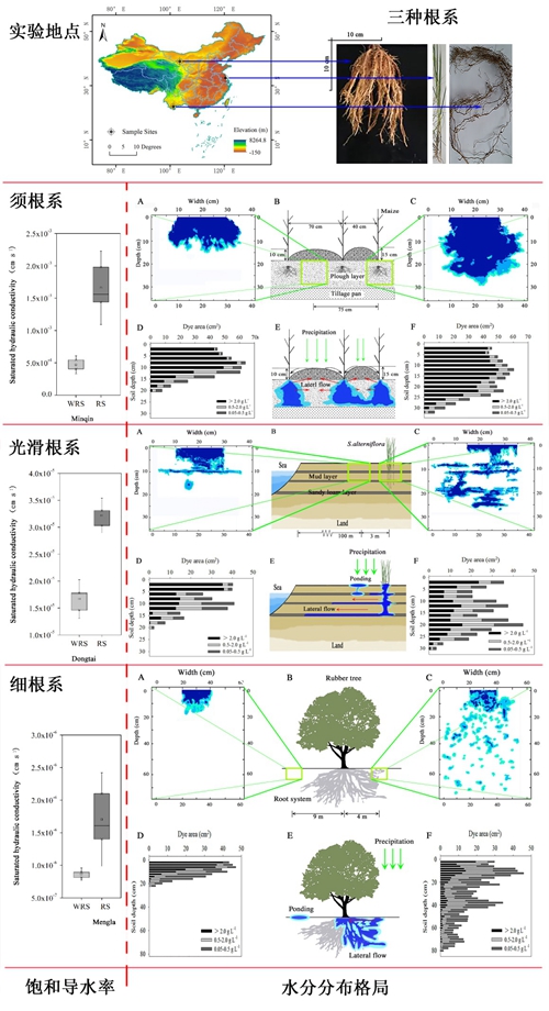为定量评价不同形态特征的植物根系对土壤水分入渗运移行为的影响,版纳植物园生态水文研究组的助理研究员蒋小金博士、刘文杰研究员等选取橡胶树的细根系(云南省热带区)、互米花草的光滑根系(江苏省滩涂地)、玉米的须根系(甘肃省农耕地)为研究对象,采用染色示踪等方法对土壤导水率、水分运移行为和分布格局等进行了相关实验,并对入渗参数、土壤物理性质之间的关系做了冗余分析。结果表明,不同形态的根系对土壤物理性能和水分运移行为的影响不同。在农耕土壤中,玉米须根系使得土壤饱和导水率(Ks)、非毛管孔隙度(Øn)分别增加了252%、26%,水分在须根系诱导下优先渗入土壤,其后的足量水分储存在孔隙良好的耕作层中,为玉米生长用水提供了保障;在滩涂土壤中,容重高、导水率低的淤泥层阻挡了水分下渗、导致了大量地表径流,而在互米花草光滑根系生长处的土壤饱和导水率(Ks)、非毛管孔隙度(Øn)则分别增加了93%、92%,光滑根系轻易地穿透了淤泥层、诱导了水分的快速下渗、诱发了优先流和淤泥层间的侧流(层间高导水率的沙壤土所致),为水分(降雨)及时从海岸排放到海洋提供了保障。在热带土壤中,单作橡胶林的管理方式导致了土壤容重增加、雨水入渗缓慢,但在细根系处的土壤饱和导水率(Ks)、非毛管孔隙度(Øn)则分别增加了96%、234%,细根系诱导了雨水快速入渗到深层土壤、大量储存于土壤孔隙中,即:细根系诱发的水分分布格局保障了橡胶树对土壤水分的及时需求。