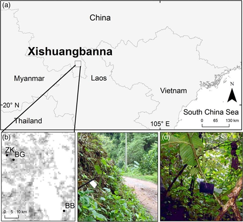 a)西双版纳自然保护区;b)研究地点;c, d)不同生境里的人工假蝴蝶(c, 开阔生境;d,林下生境)