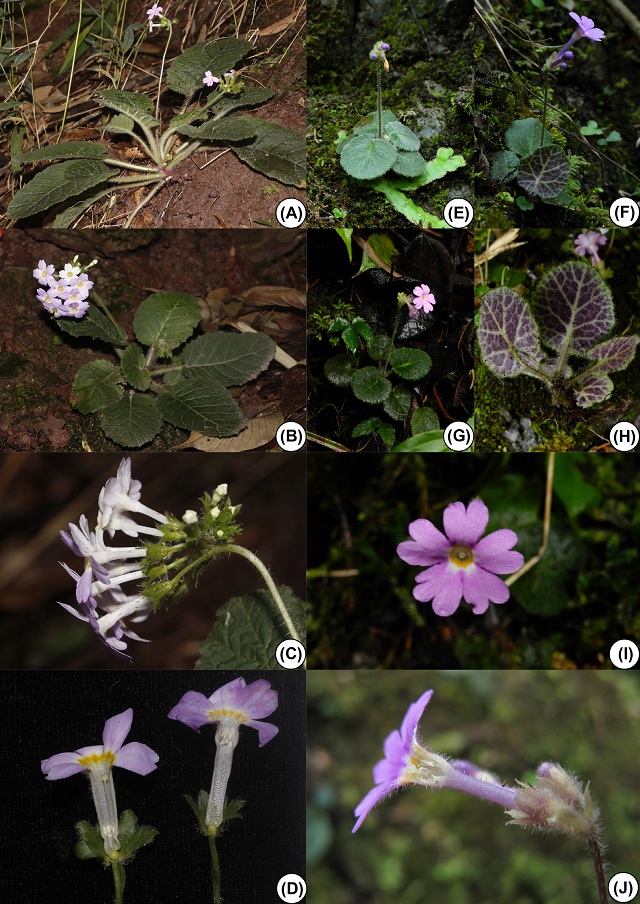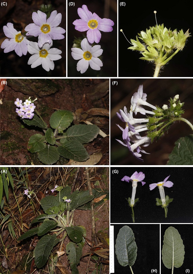 该种植株形态和毛被与分布于泰国北部的Primula intanoensis T. Yamaz.近似,但其花冠筒长1.4–1.6 cm, 长为花萼的2–2.5倍且花柱异型, (图1 A-D)而明显区别于P. intanoensis (花冠筒5–6 mm 长,与花萼近等长或稍长于花萼);毛被和花冠形态和分布于云南东南部的帽果报春 (P. calyptrata X. Gong & R.C. Fang)相似,但后者叶近圆形,叶背紫色,花柱同型 (图2)。