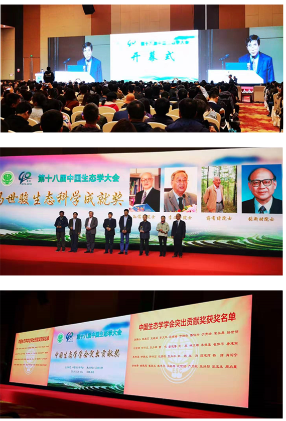 2019年11月28日,由中国生态学学会主办、云南大学承办的第十八届中国生态学大会在云南省昆明市召开。来自全国31个省、市、自治区,300余个不同单位的3000余名生态学科技工作者参加了大会。方精云院士、康乐院士、刘丛强院士、于贵瑞院士、国际生态学会主席Eun-Shik Kim、加拿大皇家科学院院士Spencer Barrett,大会主办单位中国生态学学会欧阳志云理事长,以及其他相关单位的领导出席了开幕式。此次大会恰逢学会成立40周年,与会代表观看了“奋进四十年中国生态学学会纪录片”。开幕式上,欧阳志云理事长回顾了学会成立40年来的主要工作和所取得的标志性工作成果,指出学会将持续凝聚力,着力提升生态学科创新发展、服务党和政府决策、服务科技工作者、服务科学素质提高等五方面能力,为我国经济社会发展、生态保护和生态文明建设贡献力量。安黎哲副理事长宣读了中国科协发来的贺信,中国科协高度肯定了学会为我国生态科学发展和社会进步所作出的重要贡献,期待学会携40年发展之荣光,为推动建设世界科技强国、社会主义生态文明、实现中华民族伟大复兴的中国梦做出新的更大贡献。国际生态学会主席Eun-Shik Kim在开幕式上致辞,充分肯定了中国生态学学会在国际上地位和积极作用,并希望能够与学会开展更广泛和深入的国际交流与合作。云南大学校长方精云院士热忱欢迎各位领导、专家、代表来到昆明,他表示,云南大学期待借大会召开的契机,与同道者一起,致力于服务国家战略需要,立足于生态文明建设主战场,勇挑重担、奋力而为,为建设绿色家园、美丽中国贡献智慧和力量。大会开幕式由学会副理事长吴文良主持。开幕式还举办了学会成立40周年纪念活动,颁发了“马世骏生态科学成就奖”和“中国生态学学会突出贡献奖”。这两个奖项分别表彰了对生态学理论和应用做出过巨大贡献的生态科技工作者和对学会发展做出重要贡献的科技工作者。 活动照片(一) 开幕式后,举行了大会特邀报告会。大会开幕式由学会副理事长王克林主持。云南大学方精云院士,中国科学院动物研究所康乐院士,中国科学院地球化学研究所刘丛强院士,中国科学院华南植物园任海研究员,分别从我国生态学科体系建设、动物体色形成和群体防御机制、低温地球化学与生态学研究、热带珊瑚岛植被生态系统恢复等方面做了精彩的大会特邀报告。