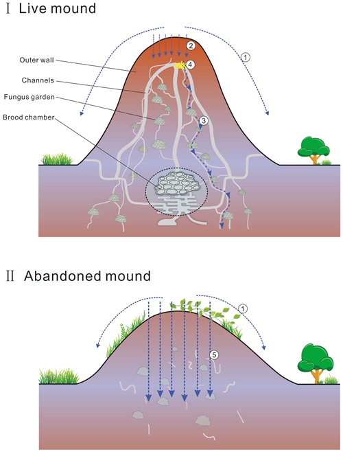 有关其土壤养分,参见Spatio-temporal variations of carbon and nitrogen in biogenic structures of two fungus-growing termites (M. annandalei and O. yunnanensis) in the Xishuangbanna region. Soil Biology and Biochemistry, 2018, 117:125-134