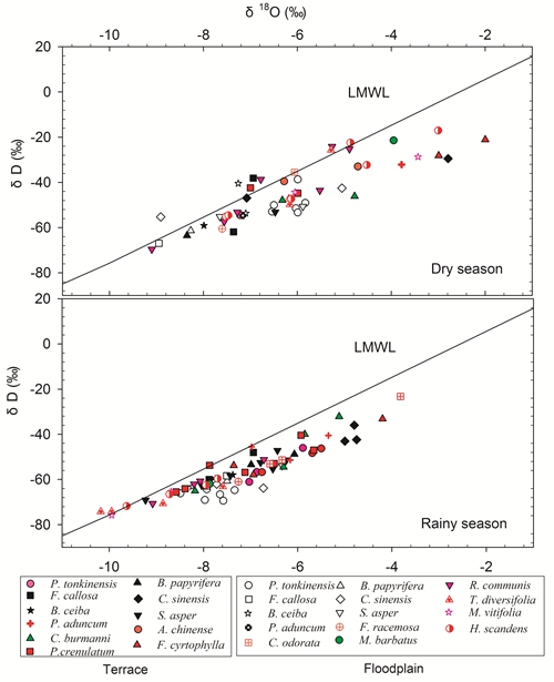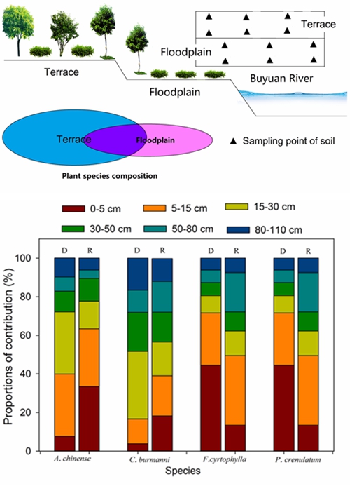 版纳植物园生态水文研究组博士研究生王平元在导师刘文杰研究员、张教林研究员指导下,采用稳定同位素、MixSIAR模型等方法对西双版纳地区河岸带植物水分获取的时空变化特征进行了测定,结果表明:大部分河岸带植物的水分获取方式都呈现了明显的季节性变化,但在空间尺度上(河岸台地、河漫滩)植物水分获取方式的差异变化不明显;旱季,大部分河岸带树种水分获取的土壤深度主要来自50 cm,雨季则主要来自浅层土壤15 cm;草本、浅根植物在水分获取方式上则没有呈现出明显的季节、空间性差异;在河漫滩区,主要利用深层土壤水的大树可能依赖于河水,而在河岸台地却并非如此,除了河漫滩地区的大型树木外,其它植物并不利用深层土壤水,也就意味着它们并不利用河水;通过对河岸带植物多样性的分析表明,大多数木本植物不适宜在河漫滩生存,只有能够适应旱季干旱胁迫与雨季短暂洪水淹没的植物才应该被引入此生态系统用于植被恢复;旱季,河水仅仅对河漫滩大树的水源有较大的贡献,但是河水通过限制河漫滩部分植物的生长与生存,在河岸带植被的形成与演替过程中起到了巨大的作用。