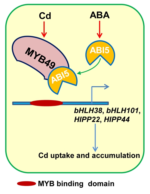 脱落酸(ABA)能够降低植物对镉(Cd)的积累,但其分子机制尚不清楚。版纳植物园园艺植物育种研究组最近研究发现,拟南芥中过量表达MYB49基因导致植株中Cd积累增加,而myb49敲除植株和表达MYB49的嵌合阻遏物(SRDX49)植株的Cd积累减少。进一步研究表明,MYB49通过直接结合bHLH38和bHLH101基因的启动子序列,以正向调控其表达,从而激活IRT1基因表达 (IRT1编码一种参与Cd吸收的金属转运蛋白)。MYB49还可以直接调控HIPP22和HIPP44基因的表达,最终调控了Cd累积。另一方面,作为调控植物细胞Cd吸收的反馈机制,Cd诱导的ABA使得ABI5表达上调,其蛋白产物与MYB49相互作用,并阻止其与下游靶基因的启动子结合,从而减少Cd积累。该研究结果为ABA信号调控的植物Cd吸收和累积的分子机制提供了新的见解。