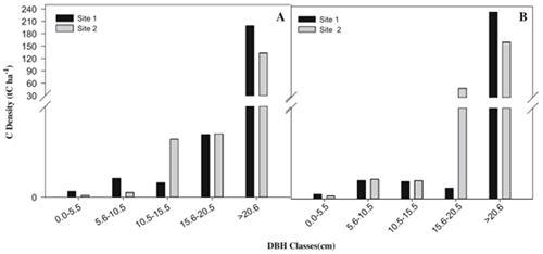 3、 哀牢山亚热带常绿阔叶林生态系统碳储量为176.35—243.97 t C ha-1, 其中90% 以上的碳储量是由胸径(DBH)>15.6 cm的乔木贡献的,而DBH>20.6 cm乔木的碳储量分别占研究样地1、样地2碳储量的77% 、49%。