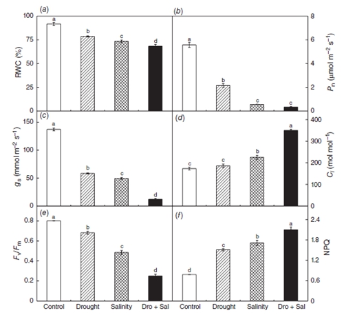 干旱和盐化是最为常见且并发的非生物胁迫因子,极大地限制着植物的生产力水平。随着气候变化和人们对土地、水和能量等资源需求的与日俱增,这些环境胁迫也将会越来越普遍。植物可以通过形态、生理生化、分子方面的调整来适应不同的环境胁迫。然而,近期综述表明,植物的诸上变化对于环境复合胁迫的响应是独一无二的,并不能由相同的单一胁迫下其自身变化直接推断而来。因此,系统研究复合胁迫对于了解植物的生态意义和发展可持续生产力的策略十分重要。