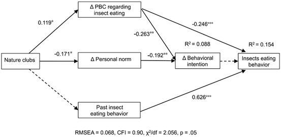 图2 路径分析模型显示:参与自然俱乐部活动对食用野生昆虫态度、个人规范、知觉行为控制、行为意向以及食用野生昆虫频率的影响。
