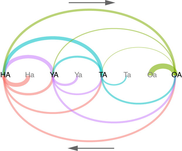 各生物区之间的交流。由区域之间和之内的扩散事件估算。相同线条颜色表示相同的目标生物群。线宽表示扩散事件的相对数量。箭头表示扩散事件的方向,从源到目标。 H,横断山;Y,喜马拉雅; T,青藏高原; O,其他地区; A,高寒生物区;a,非高寒生物区。