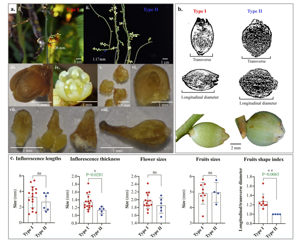 图2. 无根藤两隐存种的形态特征与统计分析结果